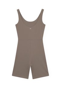 Femme debout pieds nus portant une combinaison courte sans manches olive-brun ajustée, sur un fond clair uni.