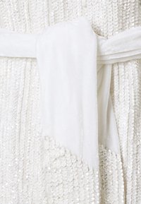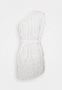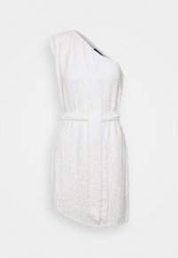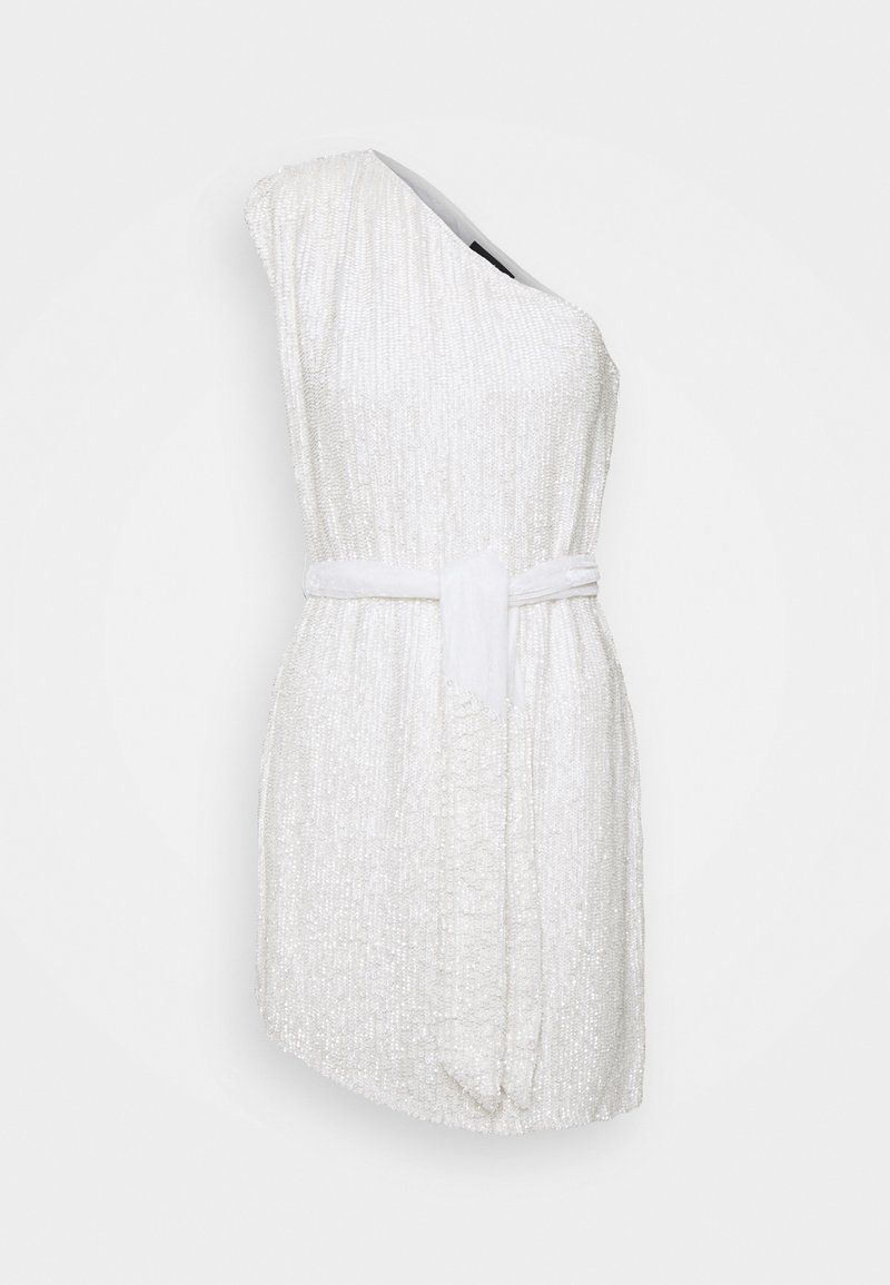Robe blanche à une épaule avec une taille ceinturée, présentant un tissu texturé et scintillant ainsi qu'une silhouette délicatement drapée.