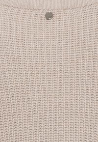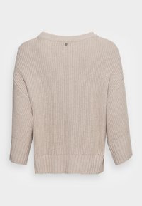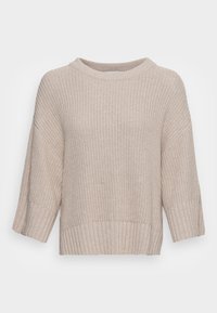 Pull beige tricoté avec une surface texturée, manches larges trois-quarts et détail de bas en côte. Tissu doux et léger.