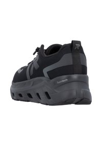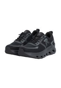 Baskets athlétiques noires et grises avec fermeture à lacets, semelle rembourrée avec trous de ventilation, et une boucle de traction au talon.