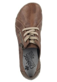 Chaussure en cuir marron avec une texture douce, présentant une semelle blanche, une fermeture éclair sur le côté, un laçage et un accent logo sur le côté extérieur.