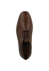 Chaussure en cuir marron avec une texture lisse, un bout arrondi et des coutures discrètes. Présente un design à lacets et une semelle en caoutchouc noir durable.