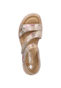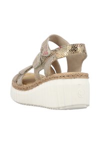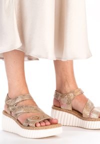Sandales à plateforme texturées dorées avec des brides croisées, un accent en jute tressé et une semelle blanche striée.