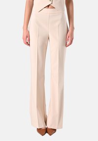 Pantalons beiges ajustés avec un design à jambes évasées, présentant des plis à l'avant et une texture lisse. Associés à des chaussures brunes à bout pointu.