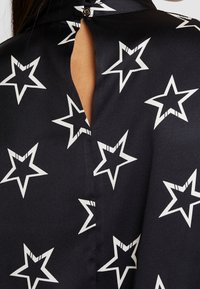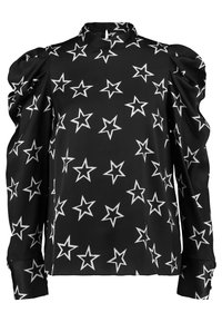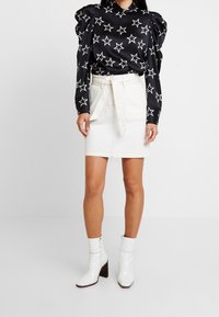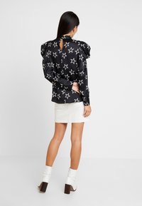 Blouse en satin noir à imprimé d'étoiles blanches, avec des manches bouffantes et un col montant, associée à une jupe en denim blanc nouée à la taille.