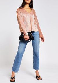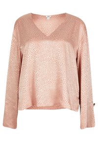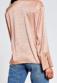 Femme portant une blouse en satin rose clair à manches longues avec un motif à pois et un décolleté en V, accompagnée d'un jean en denim bleu.