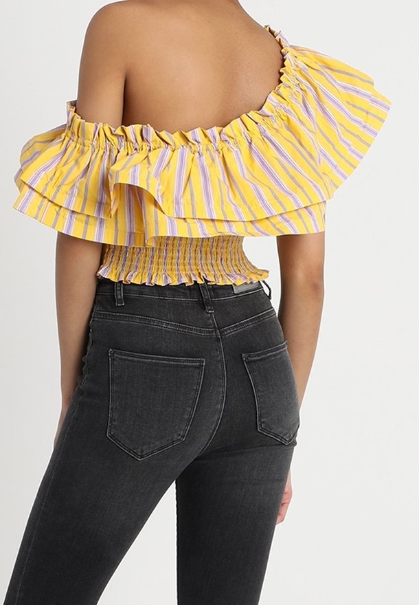 Top court à épaules dénudées rayé jaune et violet, avec un col à volants et un corsage smocké, associé à un jean noir taille haute.