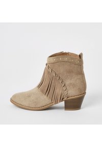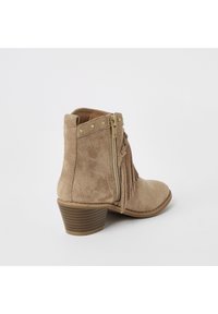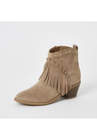 Bottine en daim beige avec détails à franges, ornée de clous dorés, bout pointu et talon empilé. Surface texturée avec accents de couture.