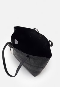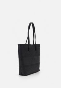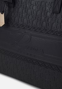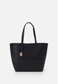 Sac fourre-tout noir en matériau synthétique texturé, avec logos embossés, deux poignées robustes et une étiquette métallique accent.