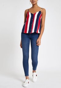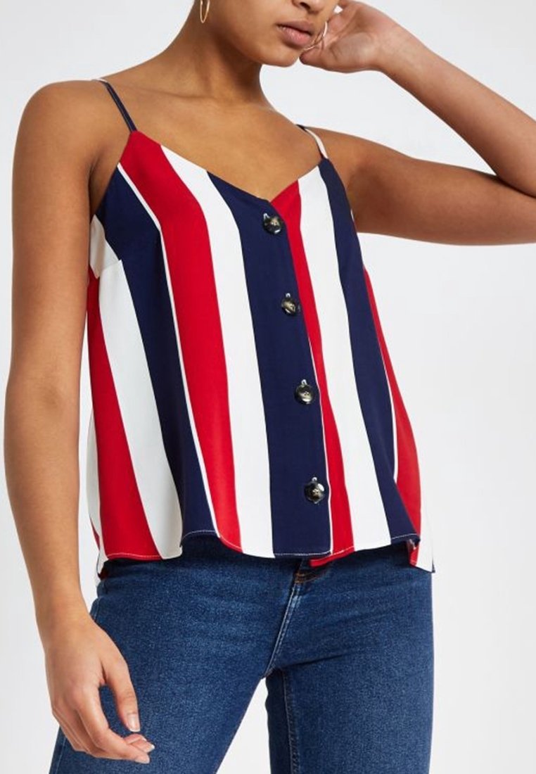 Femme portant un haut sans manches avec des rayures verticales rouges, blanches et bleues et des boutons noirs sur le devant, assorti à un jean bleu.