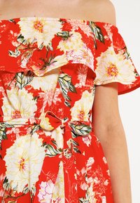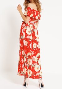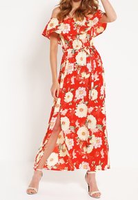 Robe maxi rouge à épaules dénudées avec un motif floral, équipée d'une ceinture à la taille et d'une fente. Confectionnée dans un tissu léger.