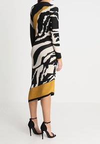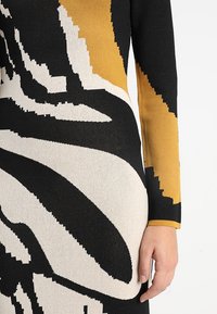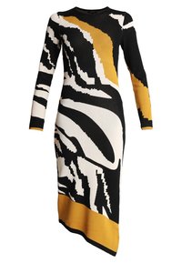 Robe midi en maille avec un motif abstrait noir, blanc et moutarde, manches longues, silhouette droite et ourlet asymétrique.