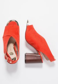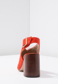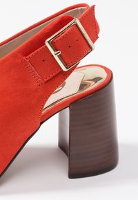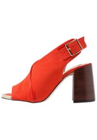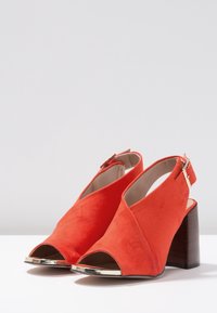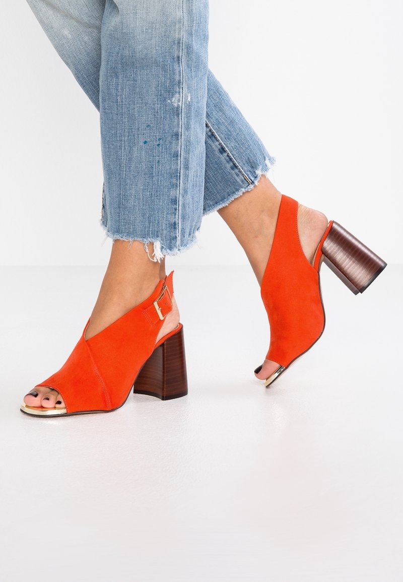 Talons ouvertes en suédine orange avec un talon en bois bloc et un détail de boucle. Pantalons en denim déchirés à revers visibles, exposant les chaussures.