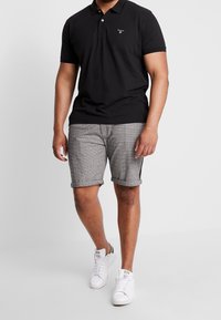 Homme portant un short à carreaux gris avec des ourlets retroussés et des baskets blanches, debout devant un fond clair uni.