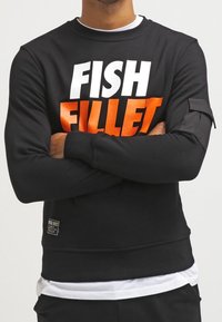 Personne portant un sweat-shirt noir avec le texte en gras « FISH FILLET » en blanc et orange, les bras croisés, superposé à une chemise blanche.