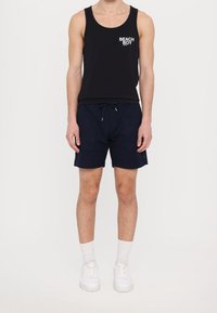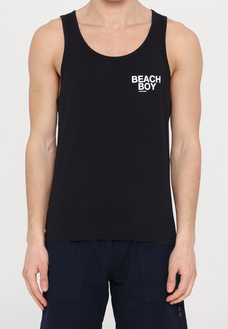 Débardeur noir en coton, présentant un col rond et un graphisme blanc "BEACH BOY" sur la poitrine. Design simple et sans manches.