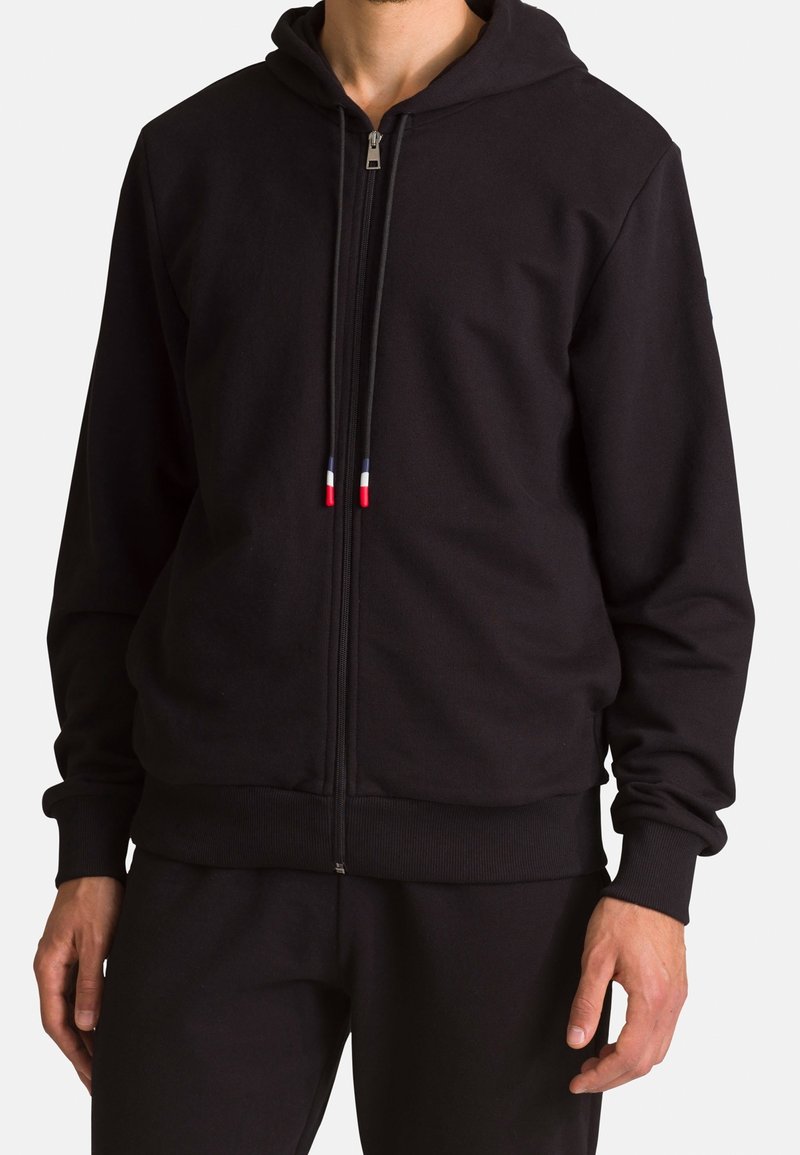 Homme portant un sweat à capuche noir zippé avec des cordons de serrage aux extrémités rouges, blanches et bleues, assorti à un pantalon noir.