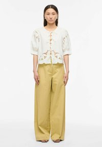 Femme portant un chemisier en dentelle blanche avec des détails noués sur le devant et des manches bouffantes, associé à un pantalon beige taille haute, debout devant un fond blanc.
