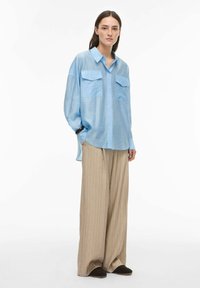 Femme portant une chemise ample bleu clair à boutons avec poches poitrine et un pantalon large beige à fines rayures, debout devant un fond blanc.