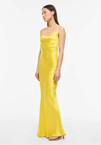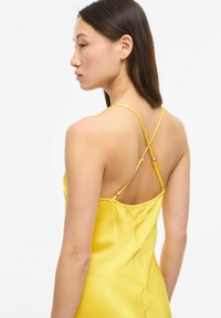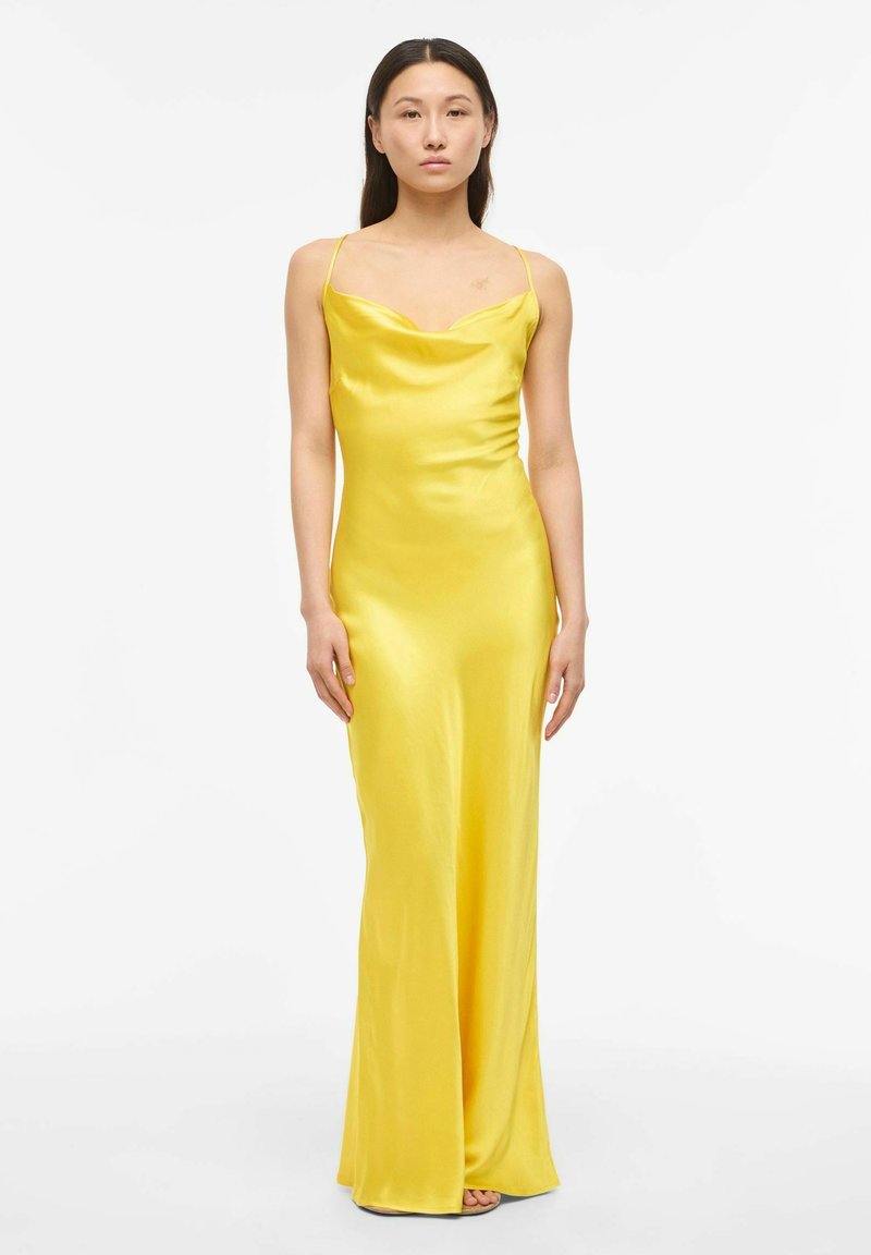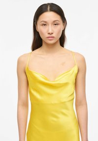 Femme debout portant une robe de soirée en satin jaune vif sans manches avec de fines bretelles sur un fond blanc uni.