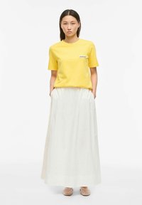 Femme aux cheveux raides et foncés portant un t-shirt jaune à manches courtes avec un écusson "ROUGE EDIT" et un pantalon blanc taille haute, les mains dans les poches.