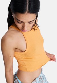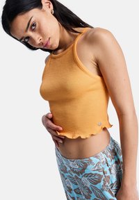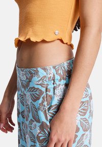Crop top côtelé orange clair avec ourlet à volants, associé à un pantalon large bleu clair orné d'un motif floral marron et d'accents texturés.