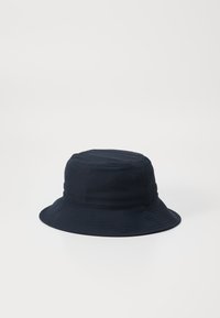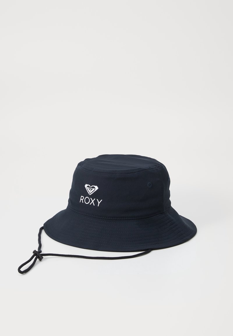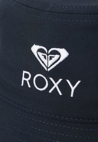 Chapeau bob bleu marine avec sangle sous le menton, avec logo et texte Roxy blancs à l'avant, présenté sur un fond clair uni.