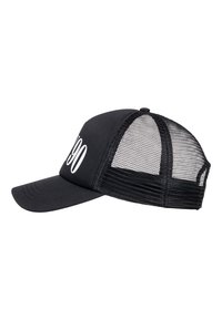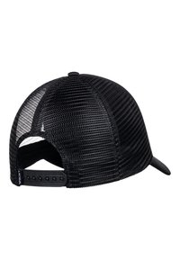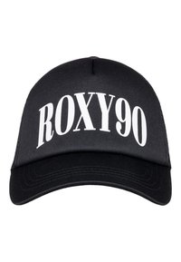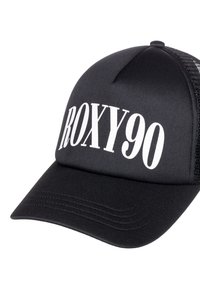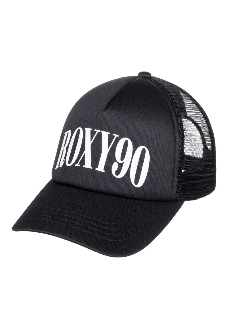 Casquette trucker en maille noire avec une visière incurvée, arborant en lettres blanches audacieuses le texte "ROXY90" sur le panneau avant.