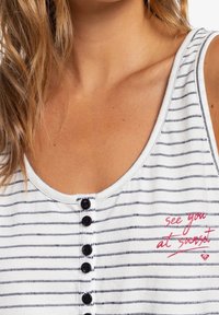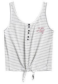 Débardeur blanc à rayures horizontales noires, avec un col rond, un détail bouton et un ourlet noué. Broderie en texte rouge indiquant "see you at."