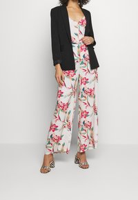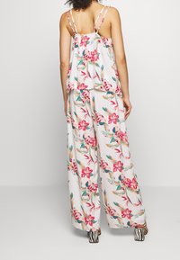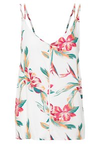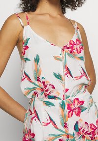 Femme portant une combinaison blanche sans manches avec des motifs floraux tropicaux aux couleurs vives rose, orange et vert, et des bretelles fines.