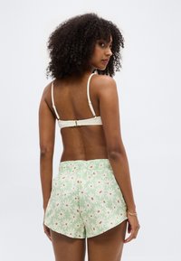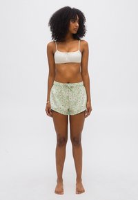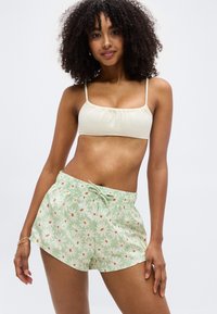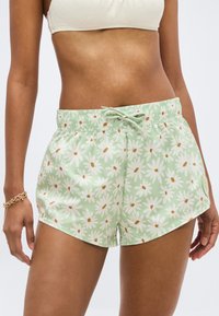 • Shorts vert menthe avec un motif floral dans des teintes plus claires, taille élastique et en tissu léger et lisse.