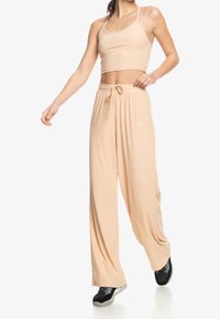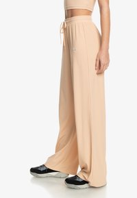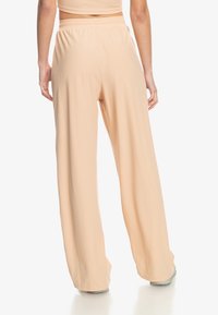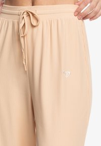 Pantalons larges à côtes pêche avec taille élastique et cordon de serrage, ornés d'un petit logo sur la cuisse. Texture douce.