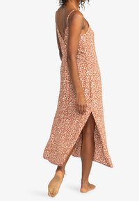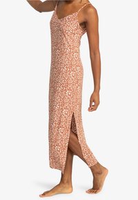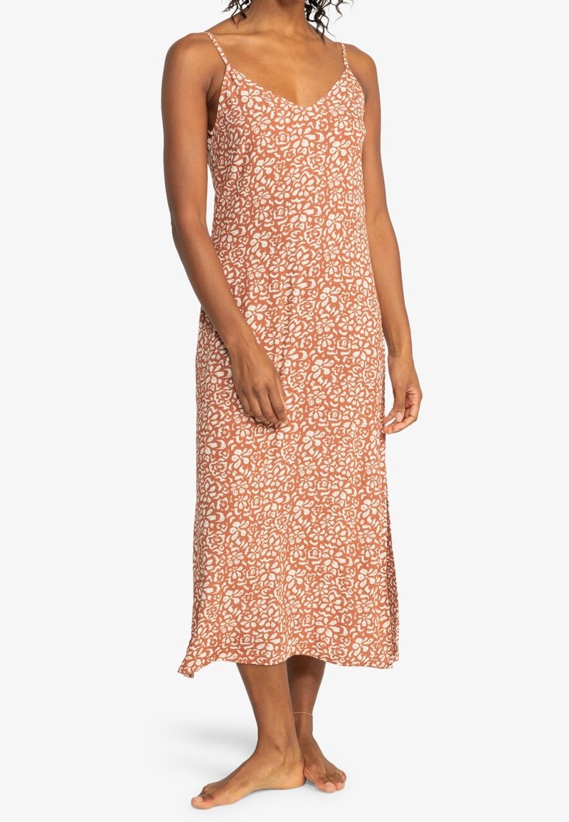 Femme portant une robe sans manches, mi-mollet, avec des bretelles fines et un fond en terre cuite présentant un motif floral blanc, se tenant pieds nus.