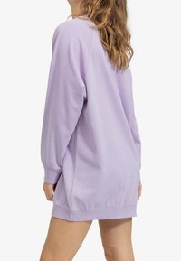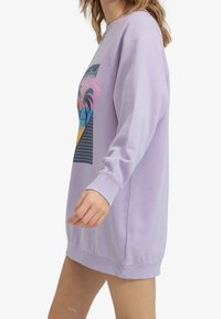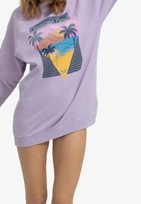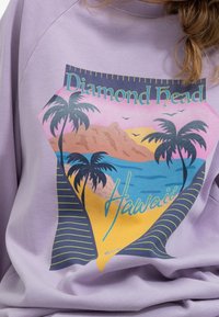 Sweat-shirt violet avec un imprimé graphique de Diamond Head, Hawaï, comprenant des palmiers, des montagnes et un soleil stylisé ; confectionné en matériau doux.