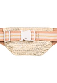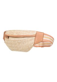 Sac banane beige tissé avec accents en cuir marron clair, poche avant zippée et sangle en tissu rayé réglable.