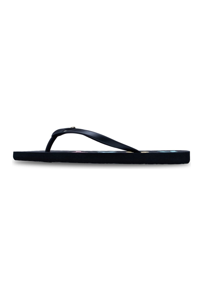 Tongs noires avec une semelle texturée, des brides en caoutchouc élégantes et une semelle intérieure à motifs multicolores. Profil simple et plat.
