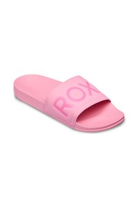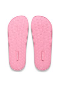 Sandale à enfiler rose en matière synthétique lisse, dotée d'une large bride avec logo en relief et d'une semelle texturée pour une meilleure adhérence.