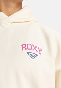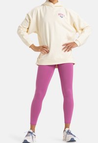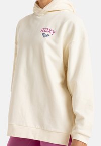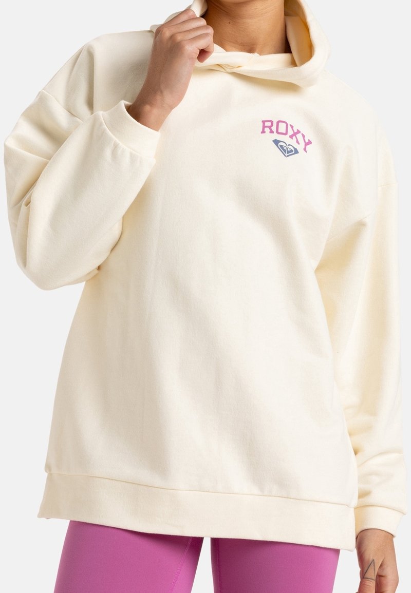 Personne portant un sweat à capuche écru oversize avec le texte et le logo "ROXY" en rose sur la poitrine, associée à un legging violet vif.