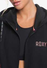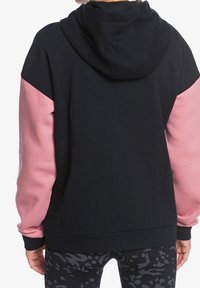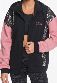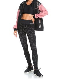 Femme portant un sweat à capuche noir zippé avec des manches roses et des panneaux à motifs abstraits, associé à des leggings noirs à motifs.