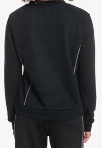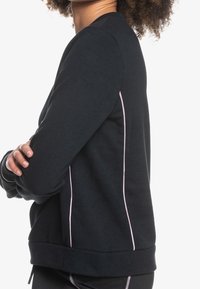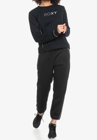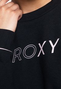 Sweatshirt noir avec des finitions roses, arborant le logo "ROXY" en texte blanc et rose sur la poitrine. Tissu doux avec un col rond.