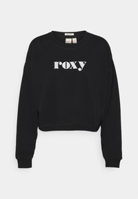 Sweat-shirt court noir avec poignets et encolure côtelés. Présente un patch graphique coloré représentant deux personnages dans un cadre circulaire sur la poitrine.