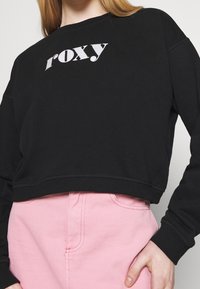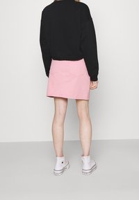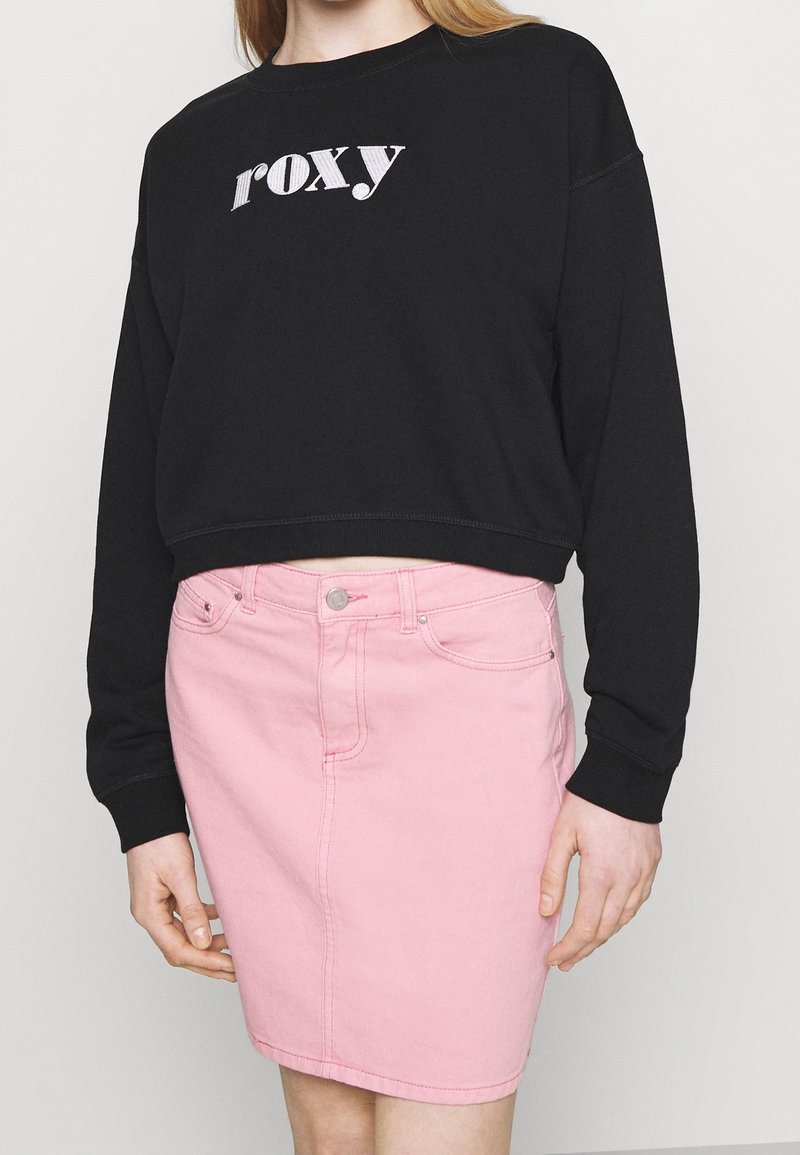 Femme portant un sweat-shirt court noir avec le texte "roxy" et une jupe en denim rose taille haute, posant devant un fond uni.