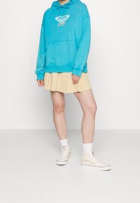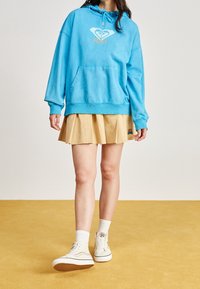 Femme portant un sweat à capuche bleu Roxy avec poche avant et cordons, associé à une mini-jupe plissée beige, sur un fond uni.