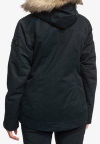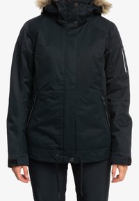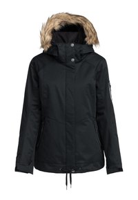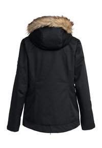 Veste d'hiver isolante noire avec capuche bordée de fourrure, fermeture éclair frontale, poches latérales zippées et bracelets de poignet ajustables.