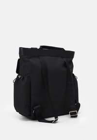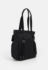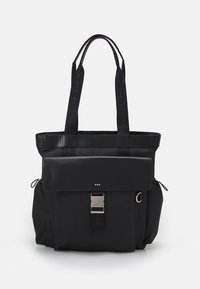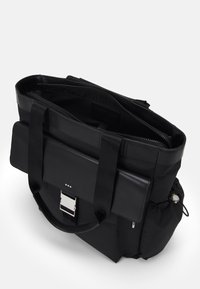 Sac cabas noir au design structuré, en matériau brillant, avec une fermeture à rabat, une quincaillerie argentée et des poches latérales, doté de bretelles à motifs.