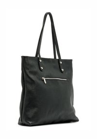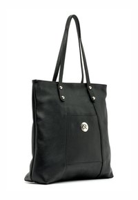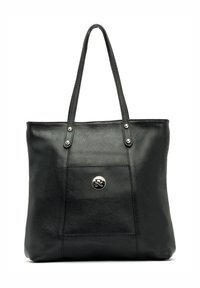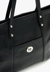 Sac fourre-tout en cuir noir avec deux longues poignées et un petit logo en métal argenté au centre avant.