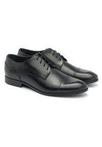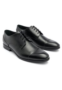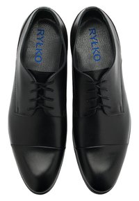 Chaussures en cuir noir, pantalon blanc et polo jaune texturé ; posture assise sur une chaise noire, fond neutre.