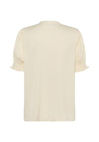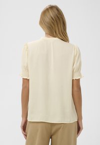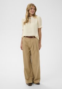Blouse de couleur crème avec un col en goutte d'eau, des manches courtes bouffantes avec des poignets élastiques, et un tissu lisse et léger. Associée à un pantalon beige.