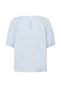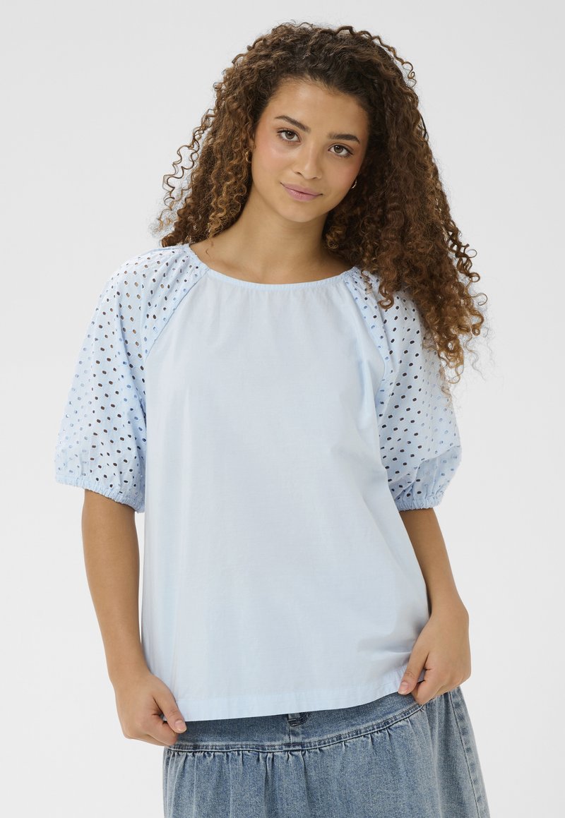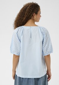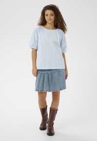 Jeune femme aux cheveux bouclés portant un chemisier bleu clair à manches bouffantes avec des broderies anglaises et une jupe en jean, devant un fond uni.