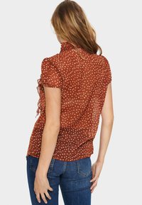 Blouse couleur rouille à manches courtes, avec un devant froncé et des pois blancs. Assortie à un jean taille haute bleu. Tissu transparent, design structuré.